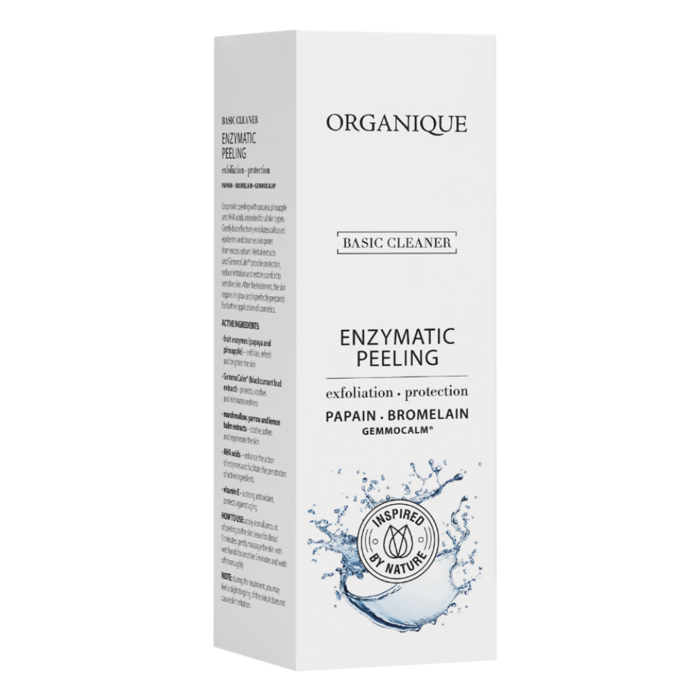 Tack vare fruktsyror från papaya och ananas exfolierar Enzymatic Peeling från Organique huden försiktigt och avlägsnar effektivt döda hudceller. Den rengör porerna på djupet och tar bort överflödig talg. Peelingen har en konsistens som en tjock kräm och doftar lätt av jäst. Den lämpar sig för alla hudtyper, även för de med akneproblematik och känslig hy med ytliga blodkärl.