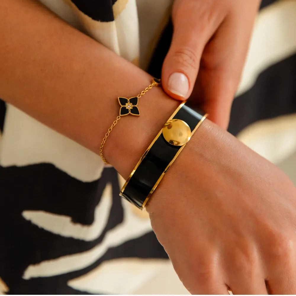 Elegant armband i ädelstål med svart emalj, tidlös och stilren design.