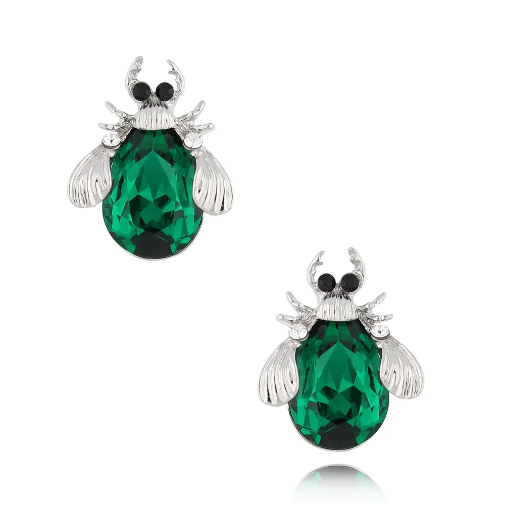 Stiftörhängen i silverfärgad mässing och kristall, gröna skalbaggar.